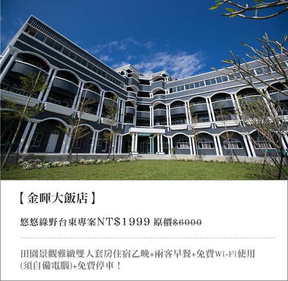 商品訊息簡述: 只要1,999元(雙人價)即可享有【金暉大飯店】原價6,000元悠悠綠野台東專案:田園景觀雅緻雙人套房住宿乙晚+兩客早餐+免費Wi-Fi使用(須自備電腦)+免費停車? 金暉大飯店-悠悠綠野台東專案